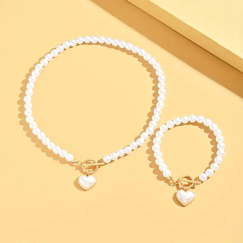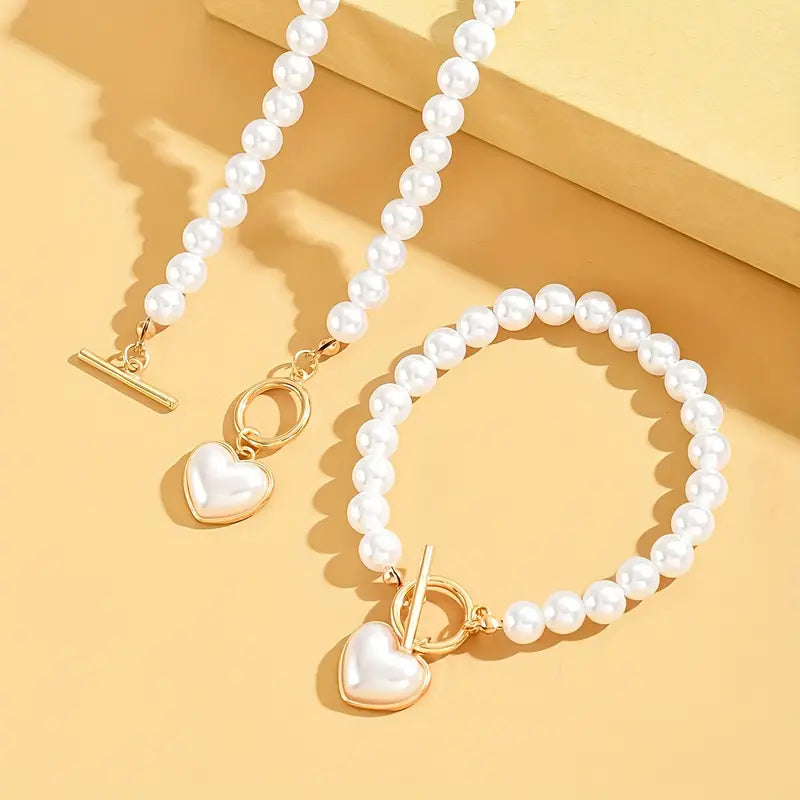 Style: This charming jewelry set features a matching necklace and bracelet adorned with classic pearls and a heart-shaped toggle clasp. The romantic detailing paired with timeless design makes it perfect for everyday wear or special occasions.